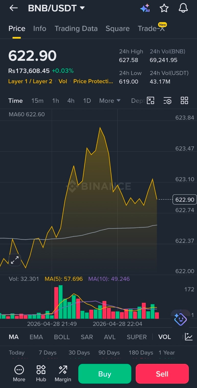 The $BNB BNB/USDT pair is currently trading at 622.90 USDT, showing a slight gain of +0.03%. Price movement over the past 24 hours has remained within a tight range, with a high of 627.58 USDT and a low of 619.00 USDT, indicating controlled volatility and consolidation.