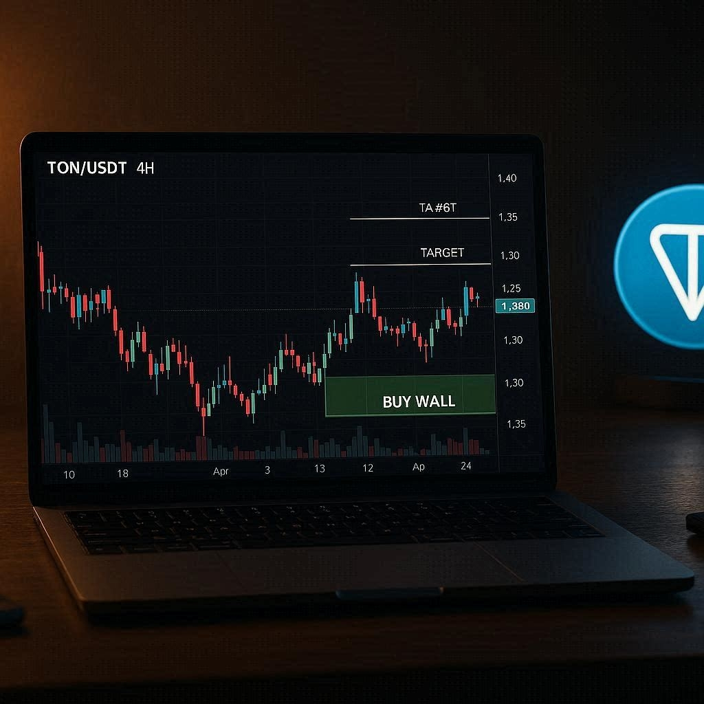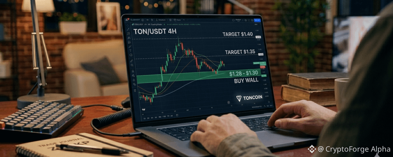 TON/USDT 4H chart with a highlighted support zone at $1.28–$1.30 and target marks at $1.35 and $1.40