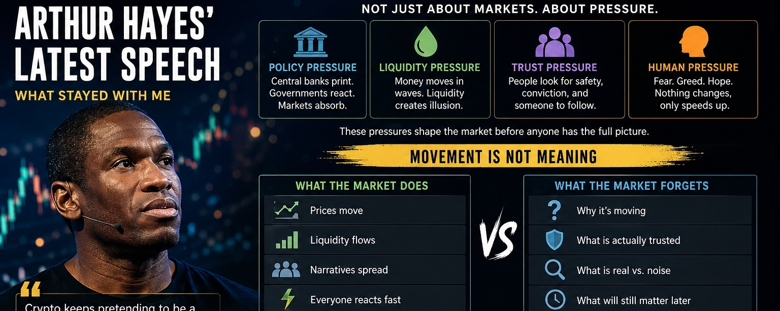 Arthur Hayes’ speech made me think less about prediction and more about pressure. The kind of pressure that builds underneath markets before people have language for it. Policy pressure. Liquidity pressure. Trust pressure. Human pressure. Crypto likes to imagine itself as something clean and separate, but it still lives inside the same old human patterns. People still chase safety. They still chase yield. They still follow confidence when it looks strong enough. They still mistake activity for proof.