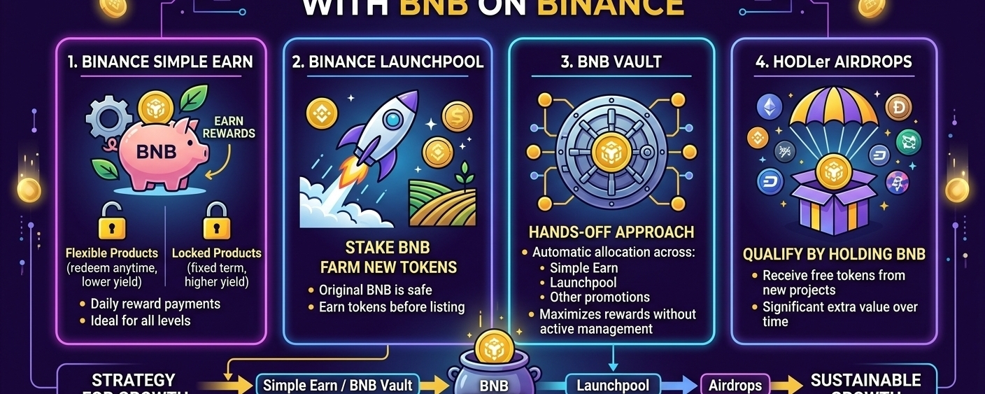 A smart long-term strategy is to keep most of your BNB in Simple Earn or BNB Vault for stable daily income, while reserving some for Launchpool opportunities. This way, you combine consistent rewards, early access to new tokens, and surprise airdrops—all from a single asset.