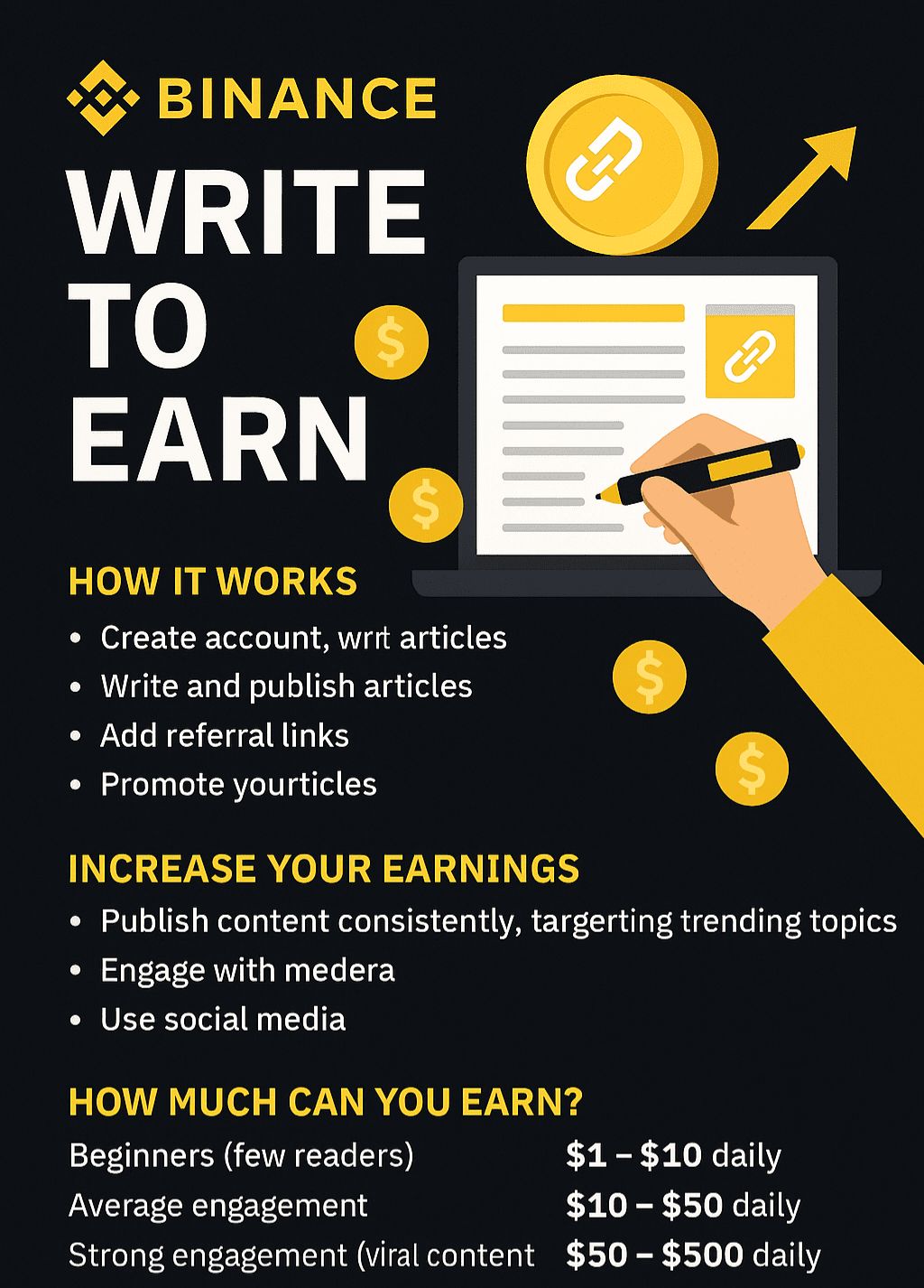 Binance Write to Earn is a content-based earning model where users publish valuable crypto-related posts, guides, updates, and educational articles. If your content gets engagement, views, or meets campaign conditions, Binance may reward you through bonuses, promotions, or creator programs.