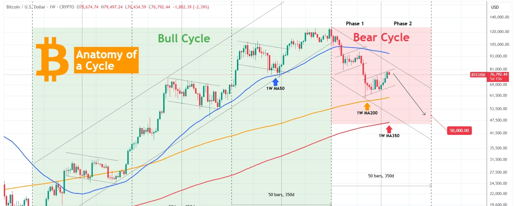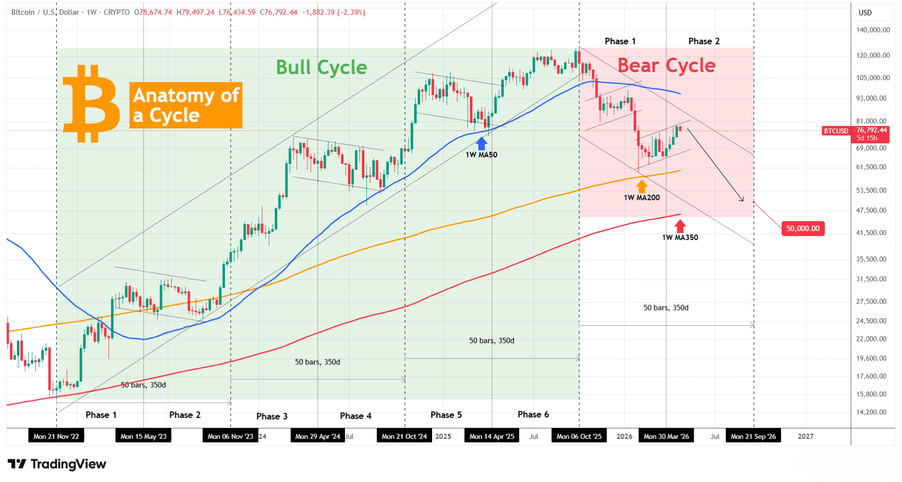 This chart is a detailed analysis of Bitcoin's (BTCUSD) full Cycle activity both Bull and Bear. The symmetry of the Bull Cycle has been incredible, from Bottom to Top it can be divided exactly into three Stages of 50 weeks (350 days) each and those further into two, bringing us 6 Phases in total.