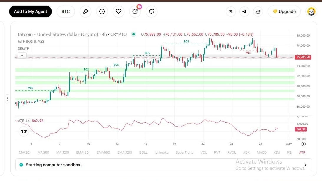 Wait for $77.5K close. Break above = bullish continuation.