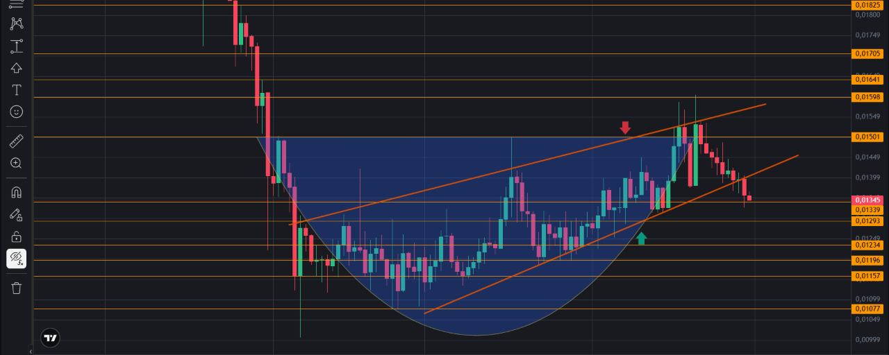 цена вышла из восходящего клина вниз и сейчас движется в нисходящем канале.