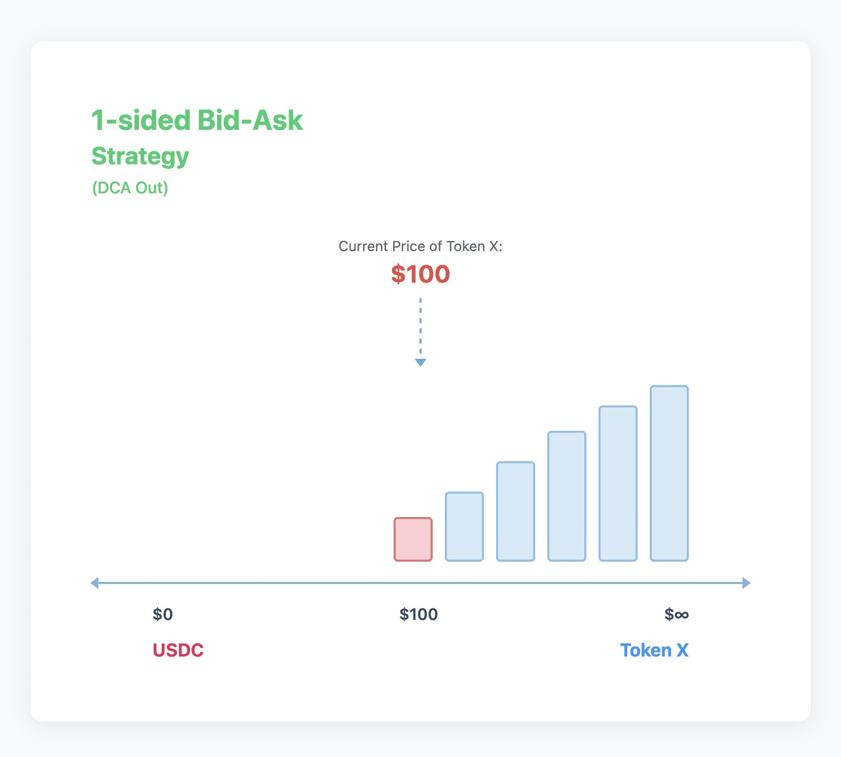 - Single-sided strategy: Maximum liquidity at the edges, decreasing towards the center, suitable for assets with high volatility, able to capture price swings and reduce impermanent loss. Suitable for DCA buying or selling trading strategies, such as holding $BTC and waiting for upward movements to sell gradually, while also earning transaction fees