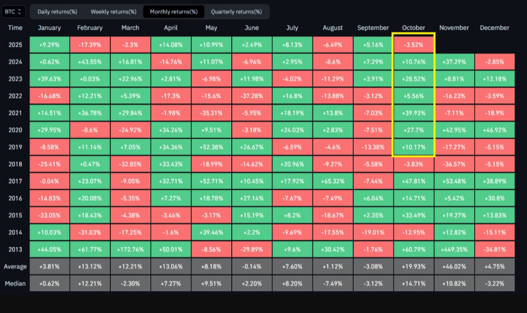 In October, the performance of bitcoin is around –3.5%, contrasting with the increases recorded between 2018 and 2024.