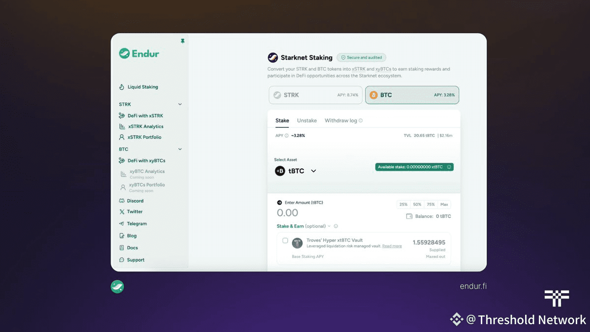 tBTC is now eligible for staking on Starknet through Endur.fi, enabling users to participate in leveraged strategies such as xtBTC’s auto-looping vaults.
