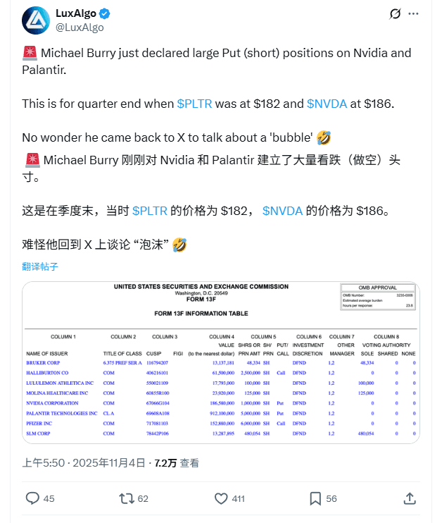 In the age of social media, one benefit is being able to see what well-known investors who are 'living in the news' really think in real time. Recently, many media reports have focused on the (big short) prototype Michael Burry, who previously shorted subprime mortgages in 2008, warning again that there is a big bubble in AI.