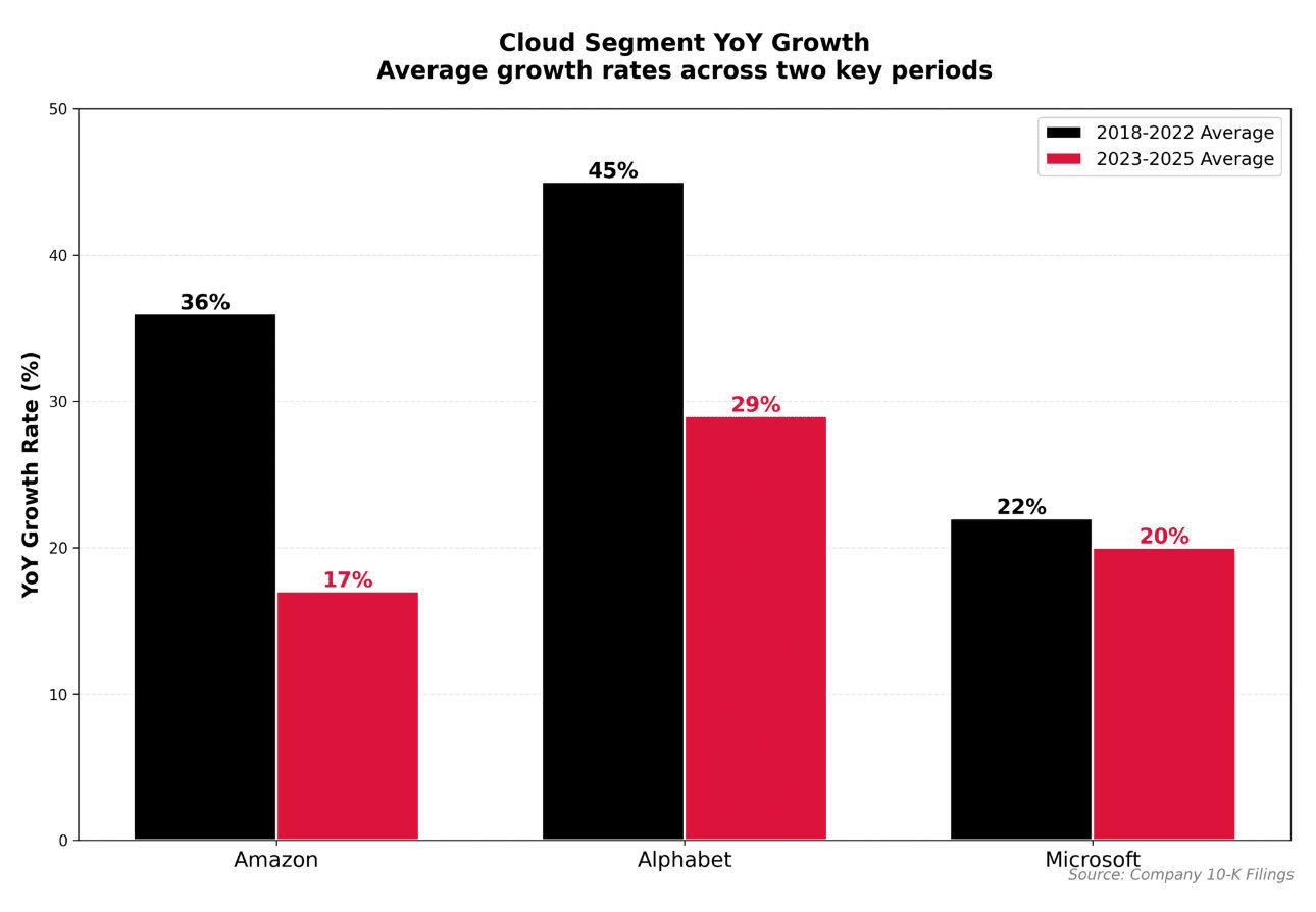 1. The growth of cloud services from Amazon, Google, and Microsoft (2023–2025 vs 2018–2022) is slowing down.