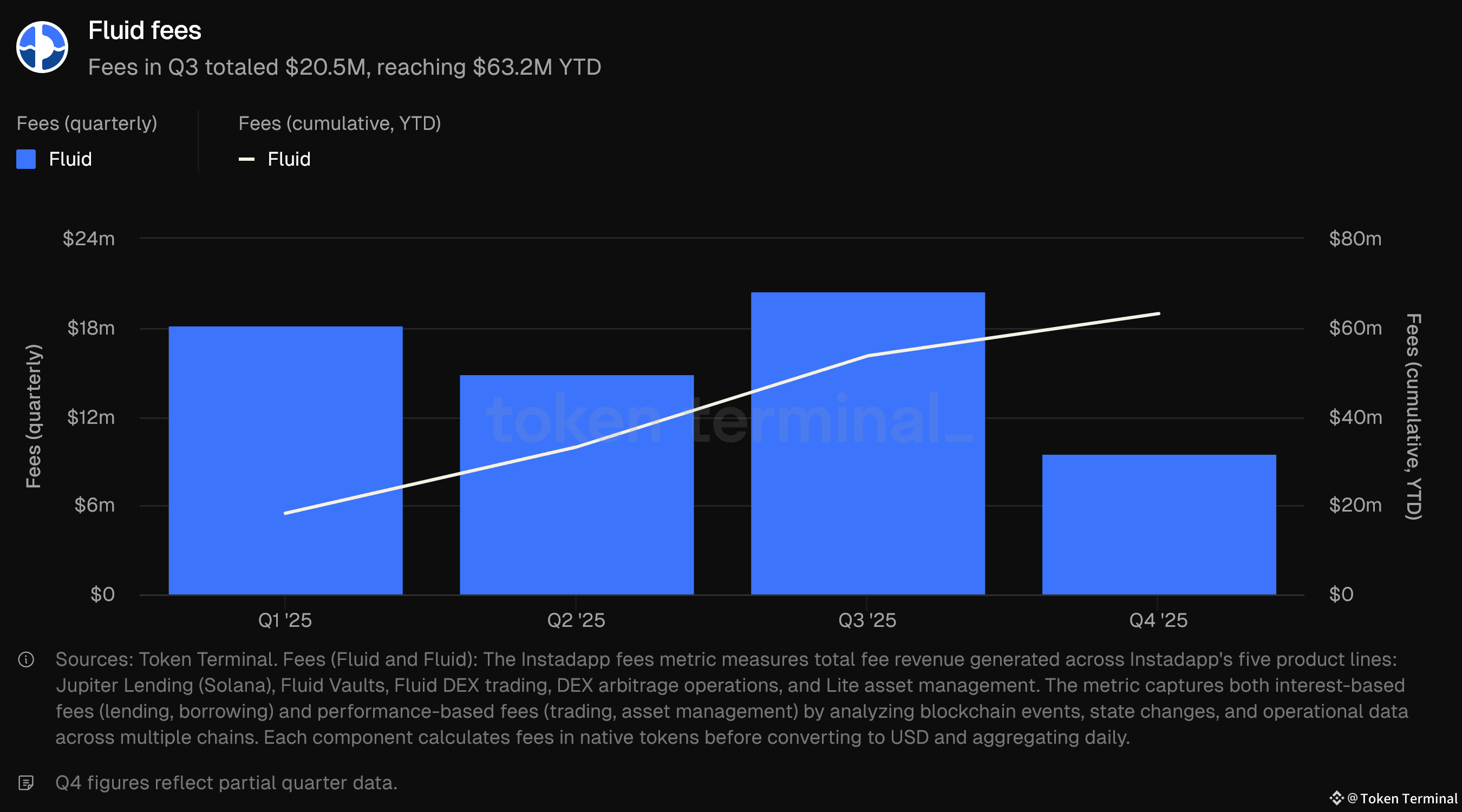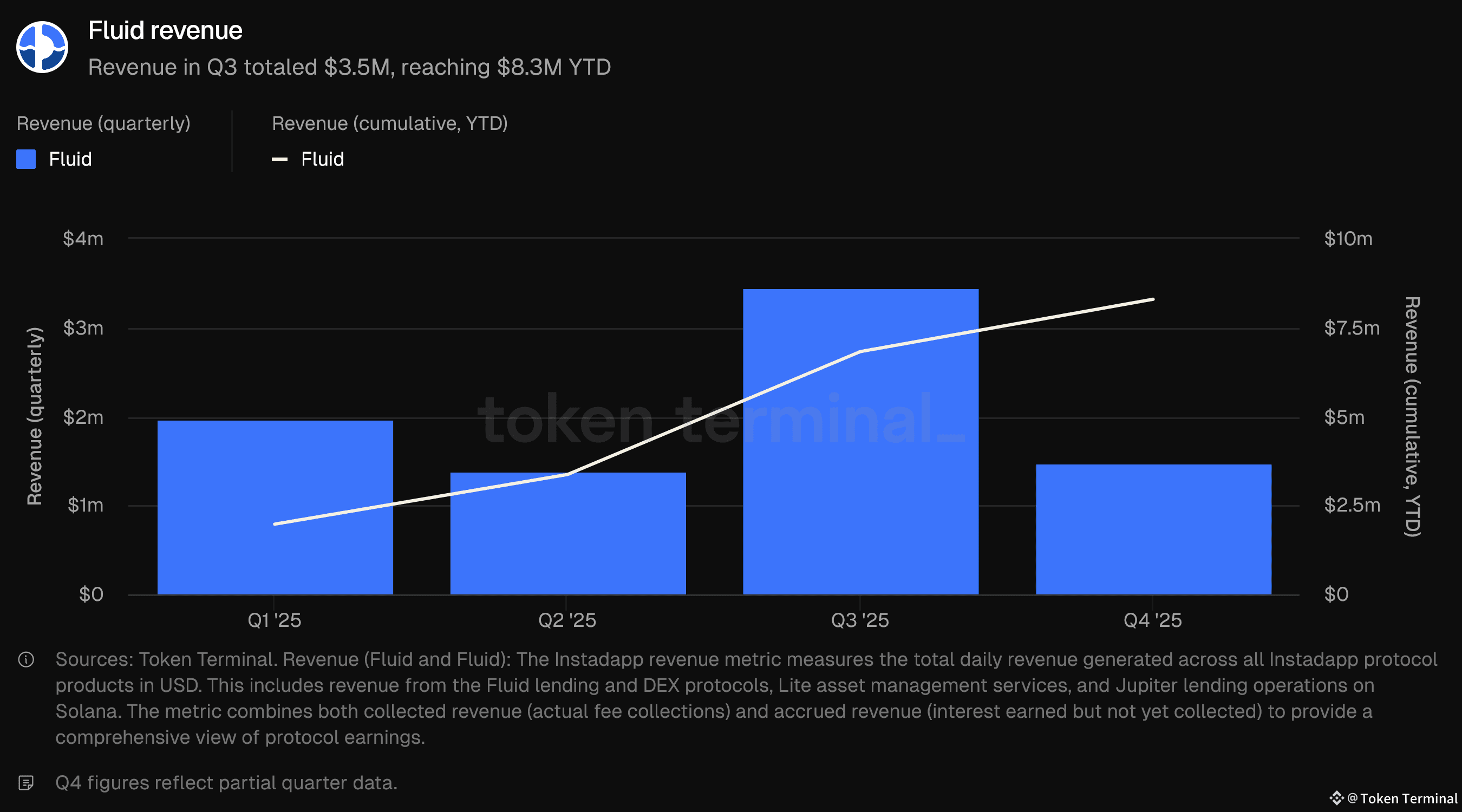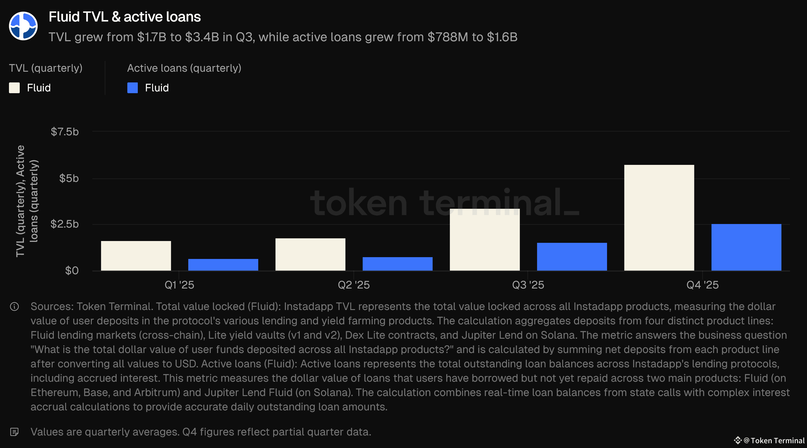 Fluid $FLUID operates as a unified DeFi protocol combining lending and DEX trading through its Liquidity Layer, a shared liquidity pool that all products draw from simultaneously. Both sides of the business had a strong quarter. Lending nearly doubled from Q2, with TVL reaching $3.4B and active loans hitting $1.6B. DEX trading volume rose from $27.6B in Q2 to $69.2B in Q3. These business lines generated $20.5M in fees and $3.5M in revenue in Q3, while monthly active users grew from 52K to 102K.