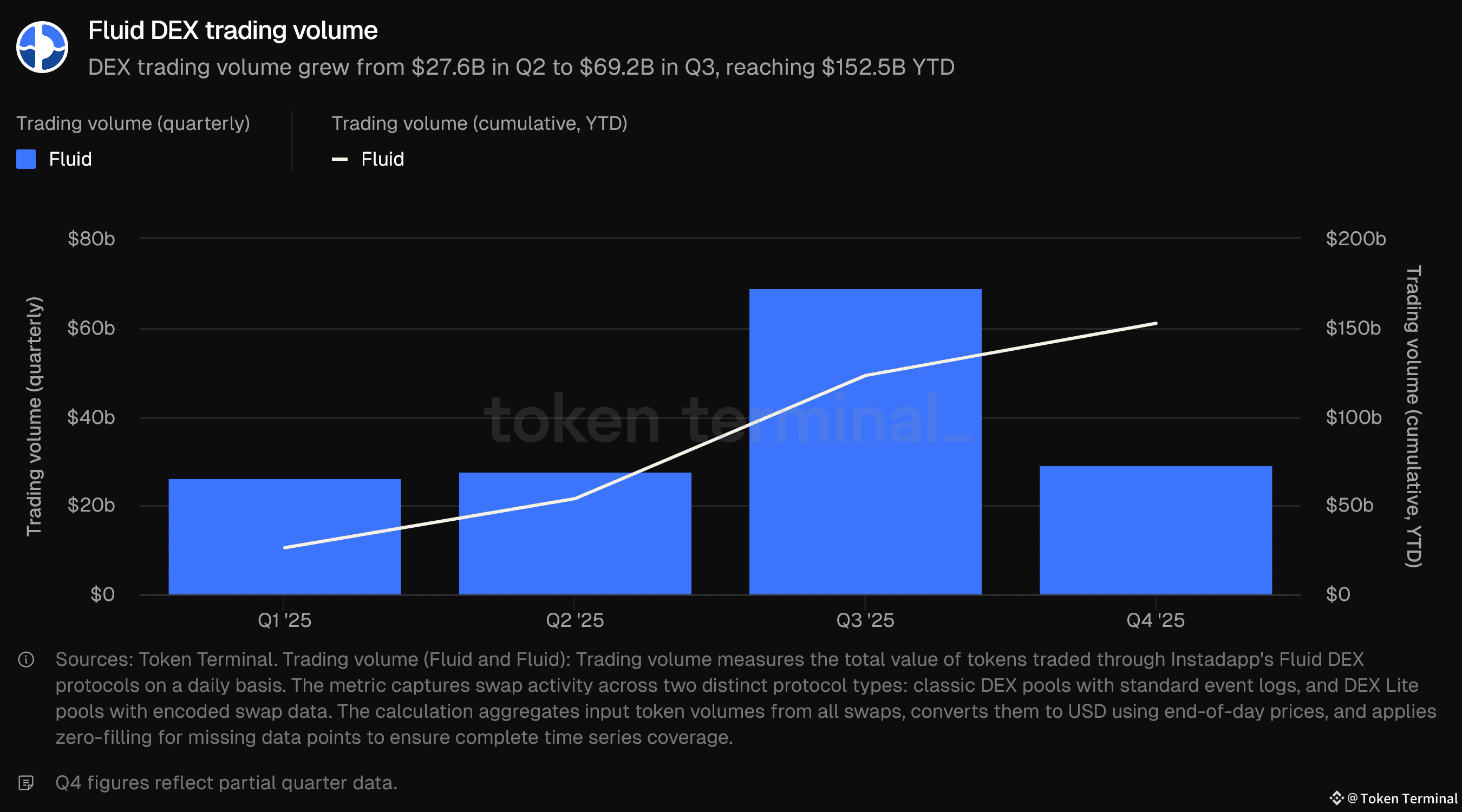 The protocol’s DEX trading volume rose to $69.2B in Q3, up 151% from $27.6B in Q2. DEX trading volume measures the value of tokens traded on Fluid’s DEX on Ethereum, Arbitrum One, Plasma, Base, and Polygon. Fluid’s DEX integrates directly with the protocol's Liquidity Layer, allowing the same capital to serve multiple functions simultaneously.