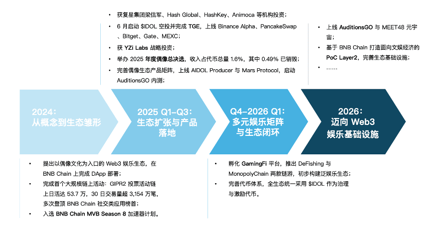 MEET48 has become a blockbuster application in the BSC ecosystem, boasting over 3.8 million active users and 500,000 on-chain wallets, with over 100 million on-chain interactions, consistently ranking first among BNB Chain social applications. The project has been selected for the BNB Chain MVB program and has received strategic investment from YZi Labs. In June 2025, MEET48 completed the $IDOL token TGE and was simultaneously listed on Binance Alpha, PancakeSwap, Bitget, Gate, and MEXC; as of November, the project's FDV market capitalization exceeded $164 million.