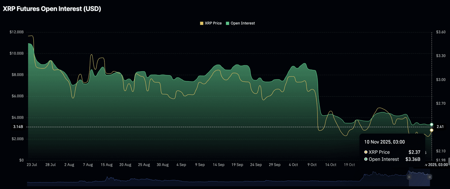 Meanwhile, retail demand for XRP remains relatively low, with open interest (OI) averaging $3.36 billion on Monday compared to $4.17 billion on November 7 and $9 billion, which was the peak level in October.
