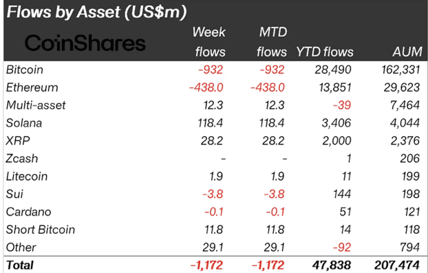 In comparison, Bitcoin and Ethereum faced significant outflows of $932 million and $438 million, respectively. In total, digital asset investment products saw outflows of $1.17 billion. CoinShares reported that the outflows were due to "post-liquidity chain volatility and uncertainty regarding a potential interest rate cut in the U.S.".