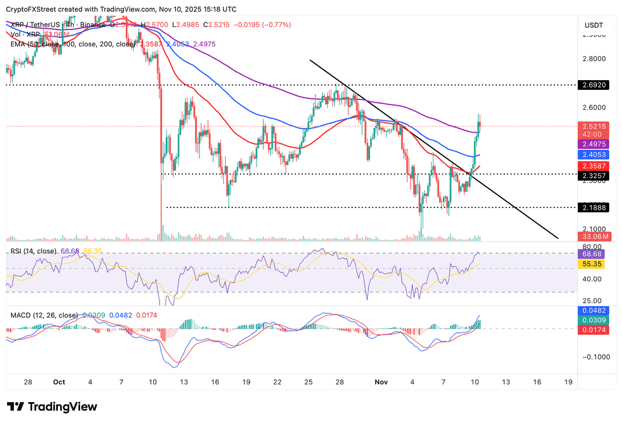 Ripple ($XRP ) rose alongside major cryptocurrencies, including Bitcoin ($BTC ) and Ethereum ($ETH ), trading above $2.50 at the time of writing on Monday. Short-term technical analysis and a return of risk-on sentiment bolster bullish expectations for XRP in the broader cryptocurrency market.
