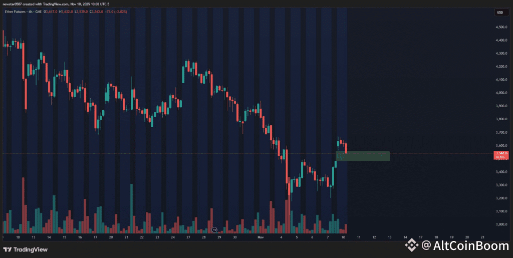 On a 4-hour Ether Futures chart, Ethereum has bounced from lows near $3,200 toward $3,600. A resistance zone is visible around $3,600, showing sellers entering the market. Price action around this area is critical for short-term momentum.