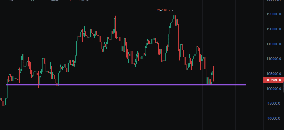 Continuing from the previous viewpoint, the market is currently sweeping liquidity, first sweeping away the liquidity from 107500-107000 upwards. As mentioned yesterday, if it cannot effectively hold above 107000, then it will sweep the liquidity down to 103800. The facts are evident: first up, then down; both long and short positions are wiped out. It feels like the current market is more like statistics, and the key takeaway from this recent movement is to avoid chasing highs and cutting losses. In terms of positioning, I warned everyone yesterday that the decline is not over and not to chase long positions. We placed a short position near 106500, targeting the previous 103000, which was also successfully achieved, and we reaped significant rewards.