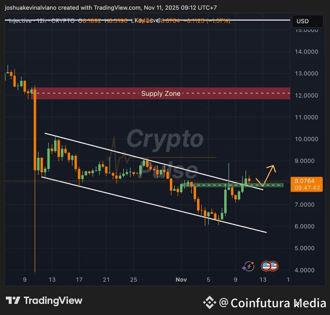 Injective (INJ) shows early signs of recovery as the token retests its breakout level around the $7.8–$8.0 range. Market participants are closely observing whether this area can act as firm support after weeks of consistent downward pressure.