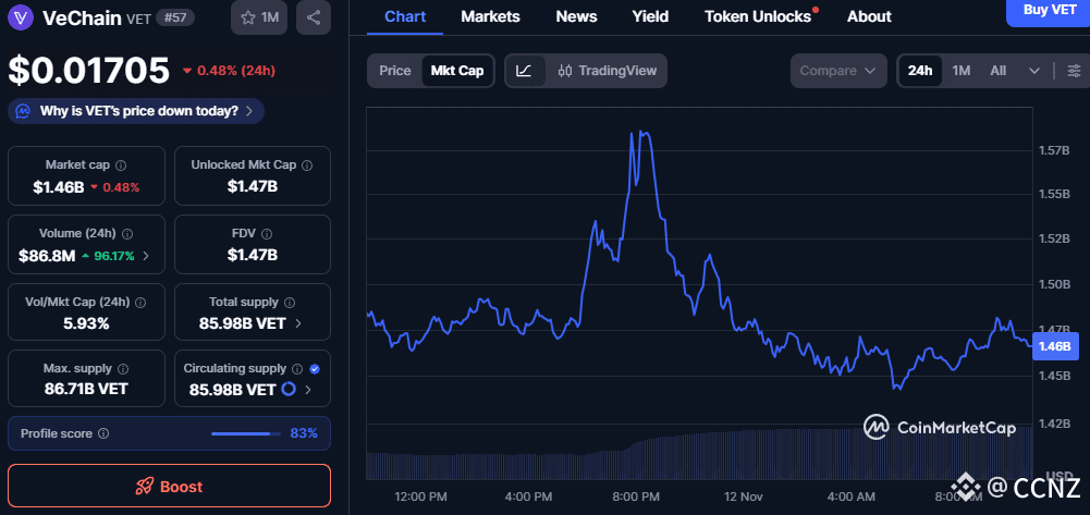 VeChain (VET) has entered a crucial consolidation phase with price action locked within a tight range near $0.0175. The cryptocurrency, currently priced at $0.01705, shows a slight 0.48% drop in the past 24 hours. However, the overall market sentiment reflects increasing volatility, which could signal a breakout or further downward movement. Traders are closely monitoring the $0.0175 pivot, as a decisive move above or below this level could dictate the next trend for VET.