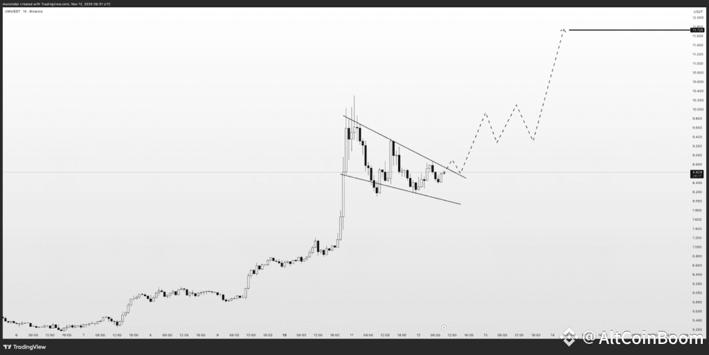 A descending wedge pattern which is often associated with trend continuation is forming.Its technical projections show a potential breakout above $8.80, targeting the $9.60 to $10.00 range before extending toward $11.70.