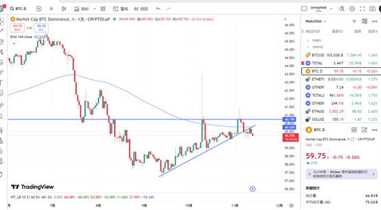 BTC.D Bitcoin Market Cap Ratio 59.75%. It has broken the ascending channel, indicating that altcoins will continue to strengthen.