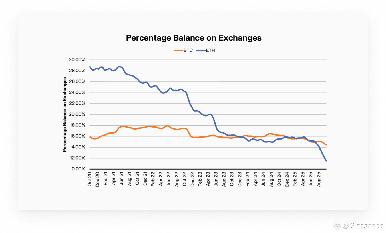 Exchange balances are falling as institutional wrappers expand: Exchange-held BTC has declined by ~1.5% and ETH nearly 18%, as assets move into ETFs and DATs.