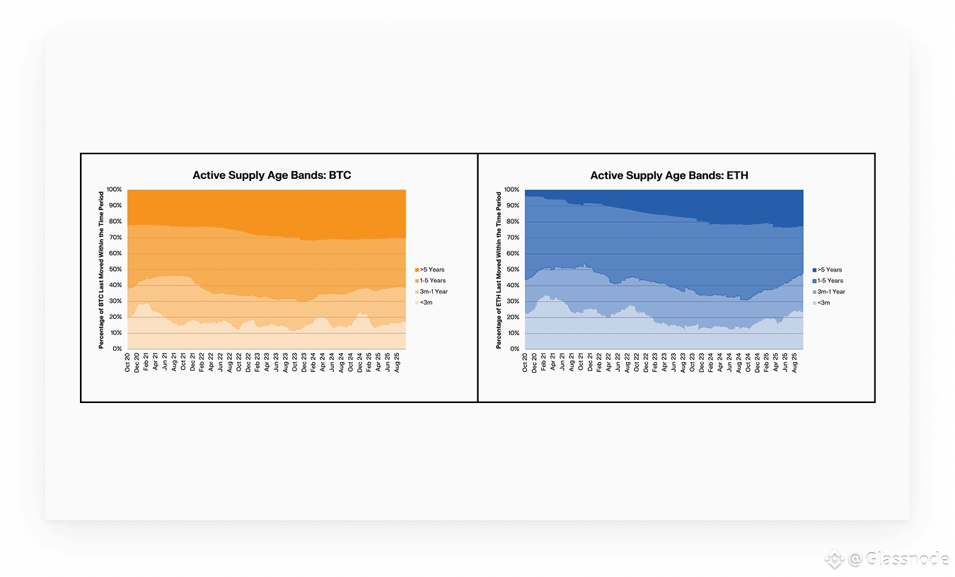 Ethereum’s supply dynamics tell a different story. Long-term holders are mobilising older coins at three times the rate of Bitcoin’s, a trend captured in age-band shifts and rising dormancy.