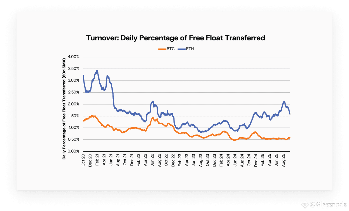 This reduction is paired with the rise of spot ETFs and DATs. Bitcoin ETFs now hold ~6.7% of supply, with DAT structures accounting for ~3.6%. For ETH, ETFs hold ~5.2% and DATs ~4.9%. This shift reallocates supply out of highly liquid venues and into structures with slower mobilisation, narrowing effective float. For Bitcoin, this supports its low-turnover, savings-asset profile. For Ethereum, it complements its role as productive collateral.