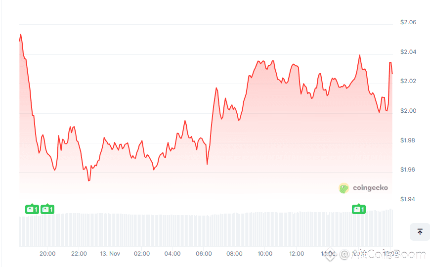 Price stability between $1.95–$2.05 shows cautious sentiment but steady liquidity and active trading volume.