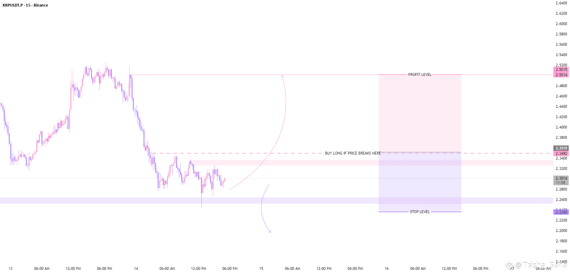 XRPUSDT on the 15-minute chart is stabilizing after a sharp decline, forming a short-term base above $2.26. Price is currently compressing beneath a clear intraday resistance band around $2.34–$2.35, which aligns with the marked breakout level. A decisive push and sustained hold above this zone would signal bullish momentum returning, opening room for a continuation move toward the $2.50–$2.52 profit target. Failure to break higher keeps price vulnerable to another retest of the lower support region, and a breakdown below $2.26 would invalidate the bullish setup and expose further downside.