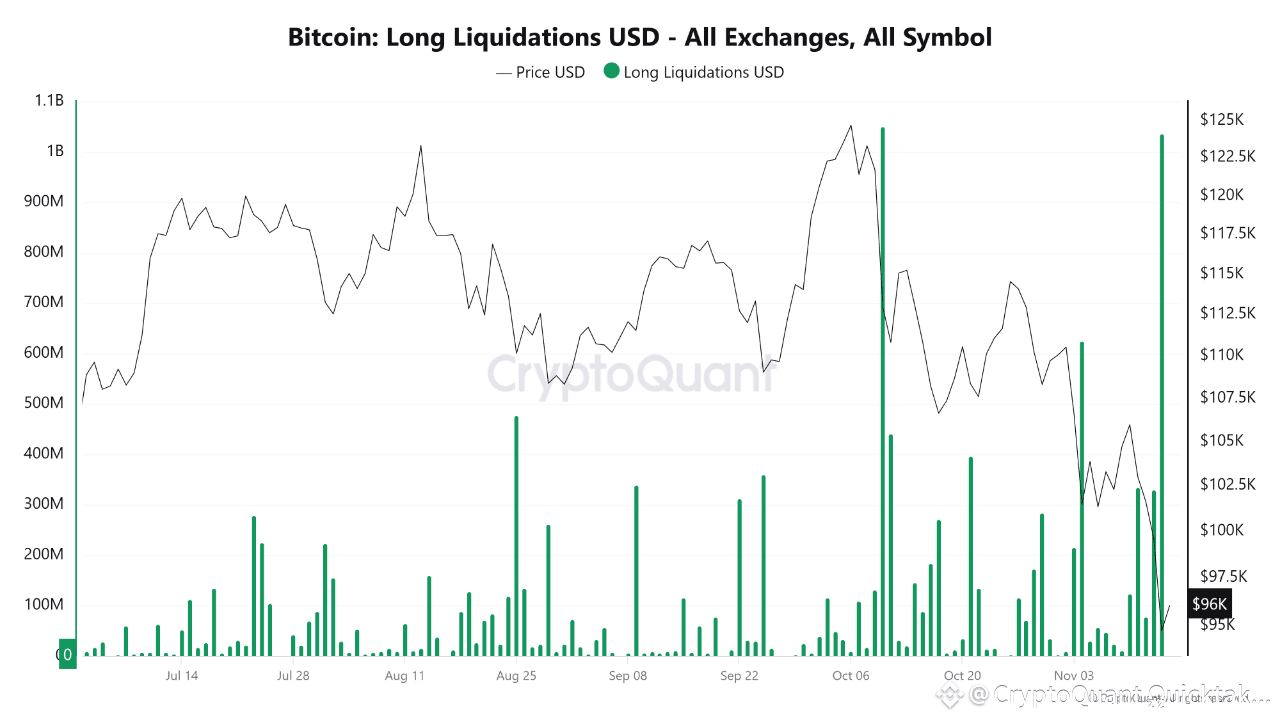 On November 14th, the Bitcoin market witnessed one of its largest long-liquidation events since June 2021. As shown in the chart, over $1 billion in leveraged long positions were forcibly closed — a volume nearly matching the liquidation cascade seen on October 10th.