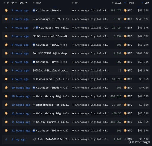 โข Whale-to-custody flows remain active, with Coinbase, Anchorage Digital, and Cumberland showing steady inbound BTC transfers such as: