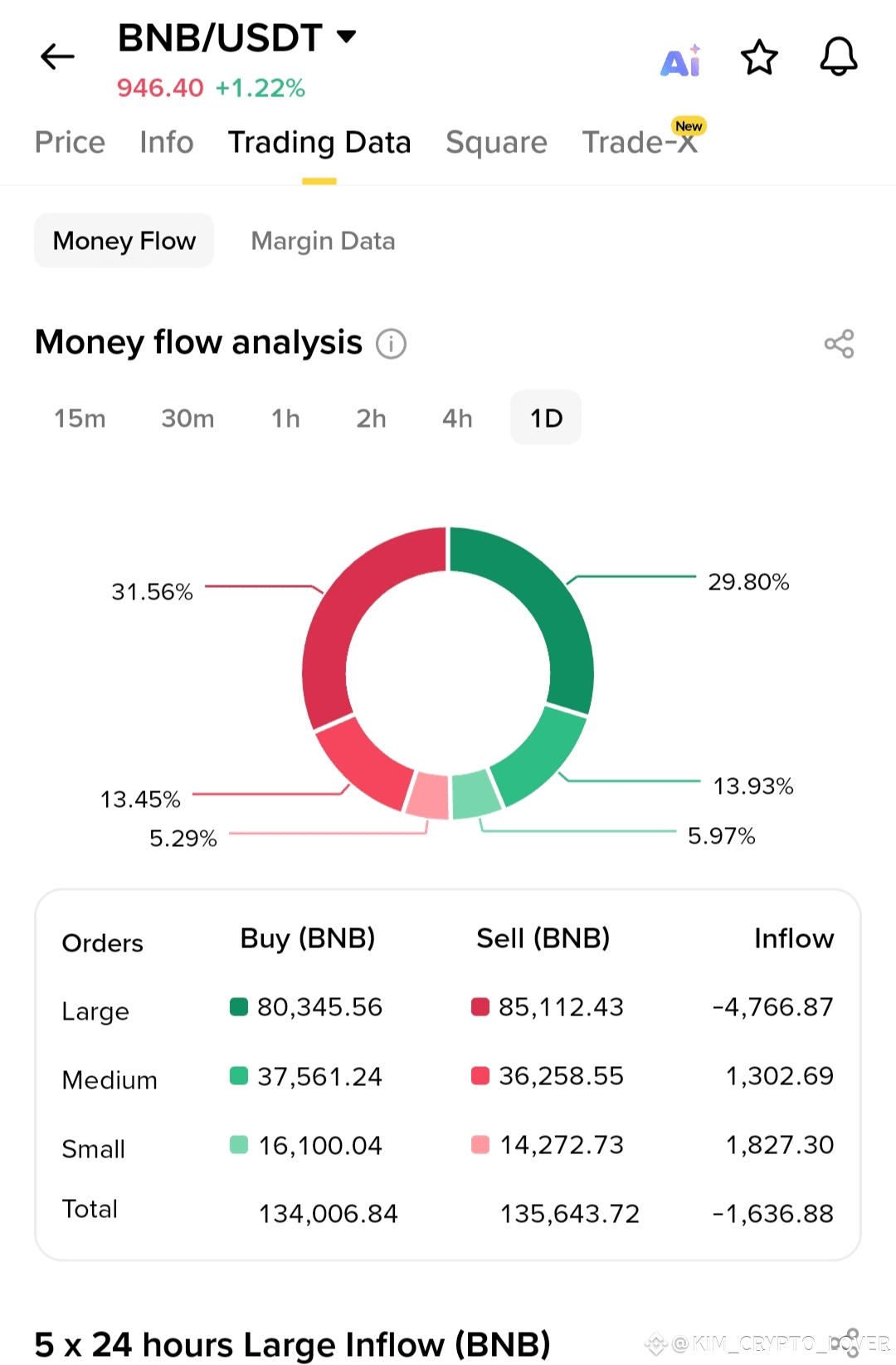 The latest 1-day Money Flow Analysis for BNB/USDT shows a mixed but slightly negative trend in overall liquidity movement. The data provides insights into how large, medium, and small traders are positioning themselves within the past 24 hours.