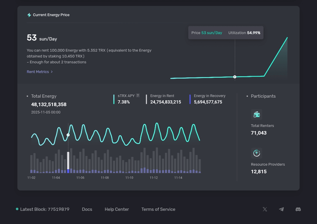 As of November 15, JustLend DAO's energy rental daily price is 53 SUN, requiring only 5.352 TRX to rent 100,000 units of energy (equivalent to the energy obtained by staking 10,450 TRX), sufficient to cover two contract transactions. The cumulative number of participating users has exceeded 70,000, becoming a core service of high-frequency demand within the ecosystem.