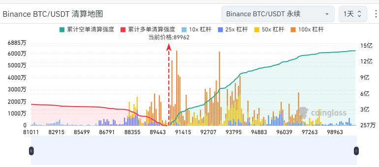 This chart is the contract liquidation map. Currently, it has dropped to 80,000 with 350 million liquidated, and risen to 96,000 with 1.1 billion liquidated. The total position situation of the contracts is moderate. The probability of a sharp rise or fall is low, but there may be a gradual squeeze.