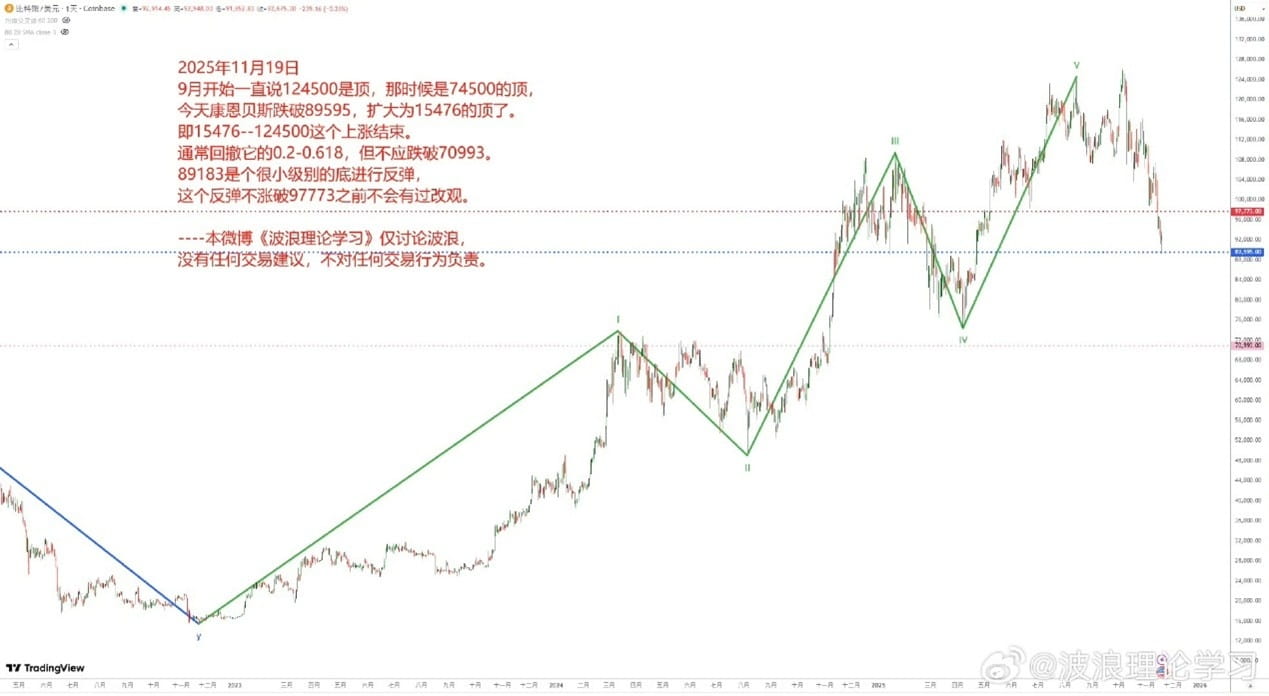 Since September, I've been saying that 124500 is the top, at that time it was 74500's top, today BTC broke 89595, expanding to a top of 15476. This means that the rise from 15476 to 124500 has ended. Usually, it retraces 0.2-0.618, but should not break below 70993.