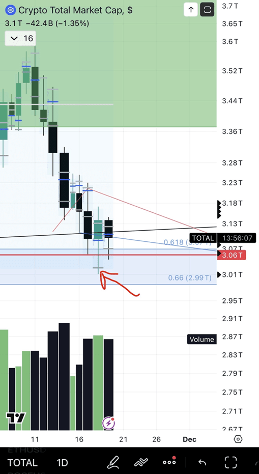 The important support level for the total market capitalization of crypto is that the third test is usually lower than the previous two. Currently, the third touch of 3T is higher than the previous two.