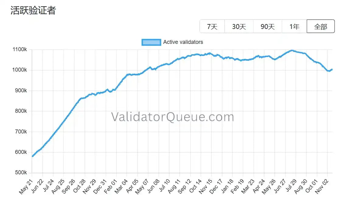 Ethereum is no different; moreover, its staking ecosystem is also showing signs of retreat. Beaconchain data shows that the number of daily active validators for Ethereum has declined by about 10% since July, reaching the lowest level since April 2024. This is the first significant drop since the network transitioned from a proof-of-work (PoW) consensus mechanism to a proof-of-stake (PoS) consensus mechanism in September 2022.