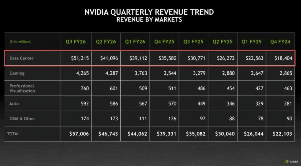● NVIDIA's revenue for the third quarter of fiscal year 2026 reached $57.01 billion, a year-on-year increase of about 62%, the first acceleration in revenue growth compared to the previous quarter since the fourth quarter of fiscal year 2024.