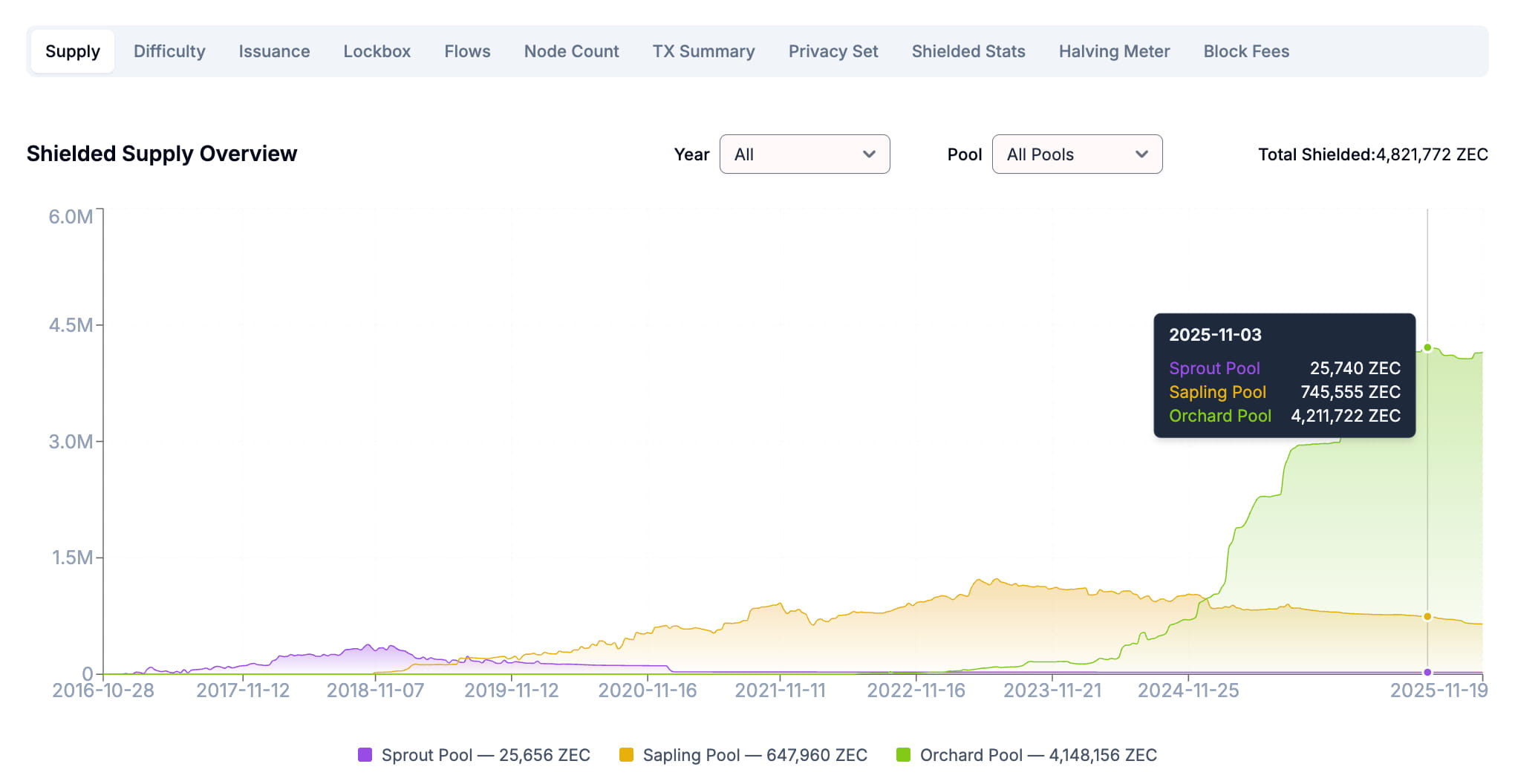 Secondly, there is genuine market demand based on its differentiated "Shielded Pool." Data shows that the total supply of Zcash (ZEC) Shielded Supply tokens once approached 5 million on November 3rd; as of this writing, that number remains above 4.82 million, representing approximately 30% of the total circulating supply; the number of on-chain transactions exceeded 26,000 within 24 hours; and the number of shielded transactions exceeded 2,200 within 24 hours. This demonstrates that ZEC's actual adoption data is extremely stable and active.