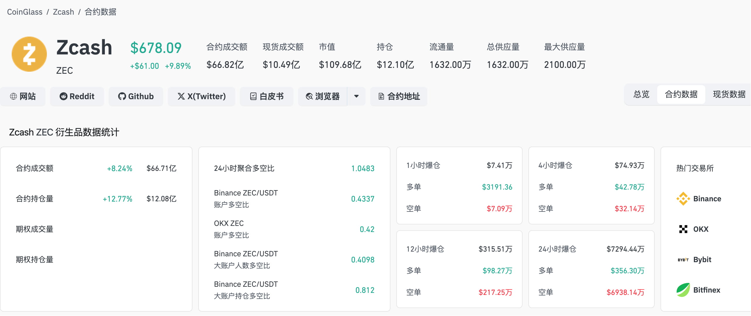 In addition, the trading volume and open interest of ZEC contracts have remained high recently: as of the time of writing, the 24-hour trading volume exceeded US$6.6 billion; the 24-hour open interest exceeded US$1.2 billion.