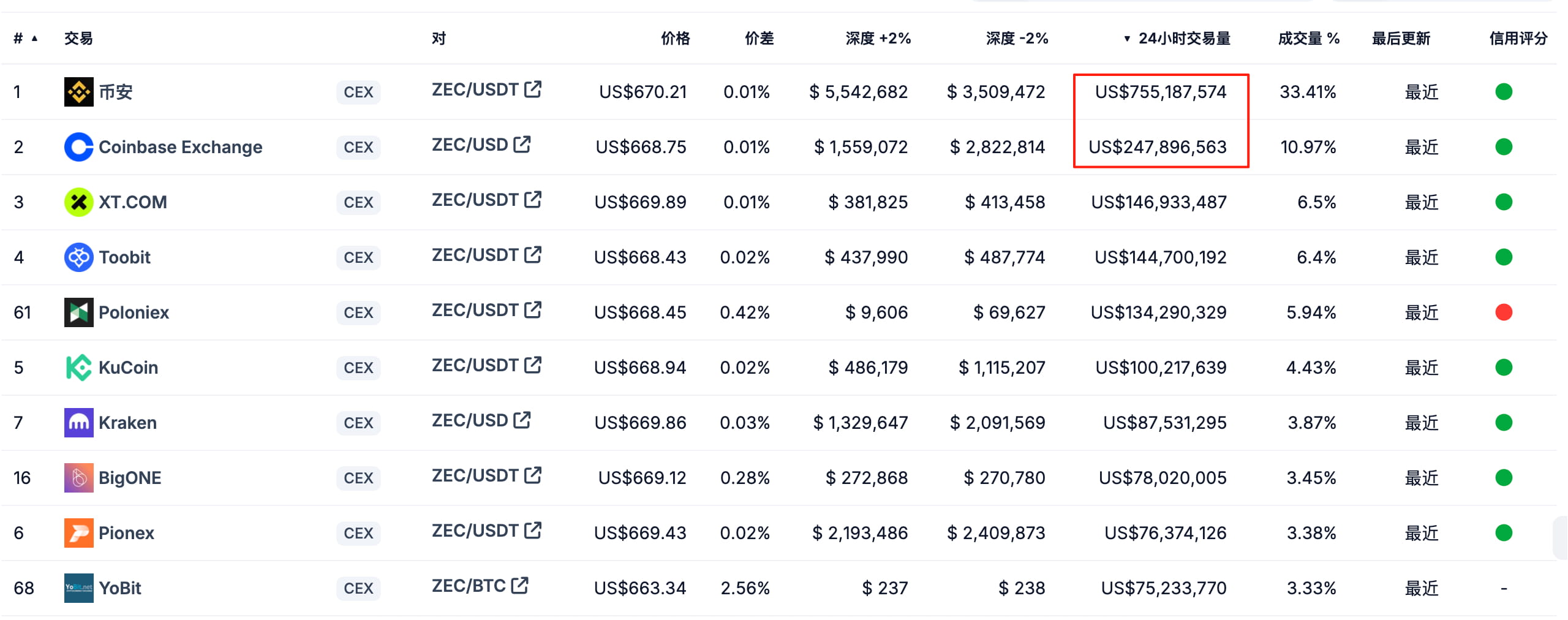 Firstly, it benefits from the ample liquidity it gains through mainstream centralized exchanges (CEXs). According to Coingecko, as of this writing, ZEC's trading volume over the past 24 hours exceeded $2.26 billion. Binance and Coinbase ranked first and second in 24-hour trading volume, with the former accounting for over 33% and the latter nearly 11%. In the current market characterized by tight liquidity, this unique "CEX niche" provides ZEC with a sufficiently large stage to attract funds and achieve growth against the trend.