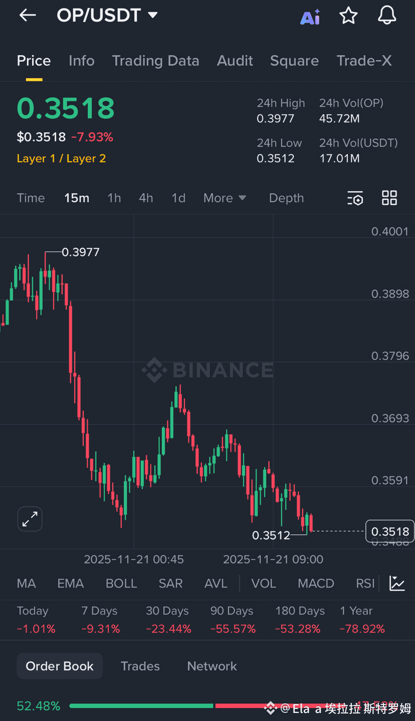 But zoom out, legends! This is classic capitulation territory. The 24-hour high was $0.3977, low at $0.3512, with volume churning at 45.72M OP and $17.01M in USDT. The order book? Bid side holding strong at 52.48% – that’s buyers lurking, ready to pounce!