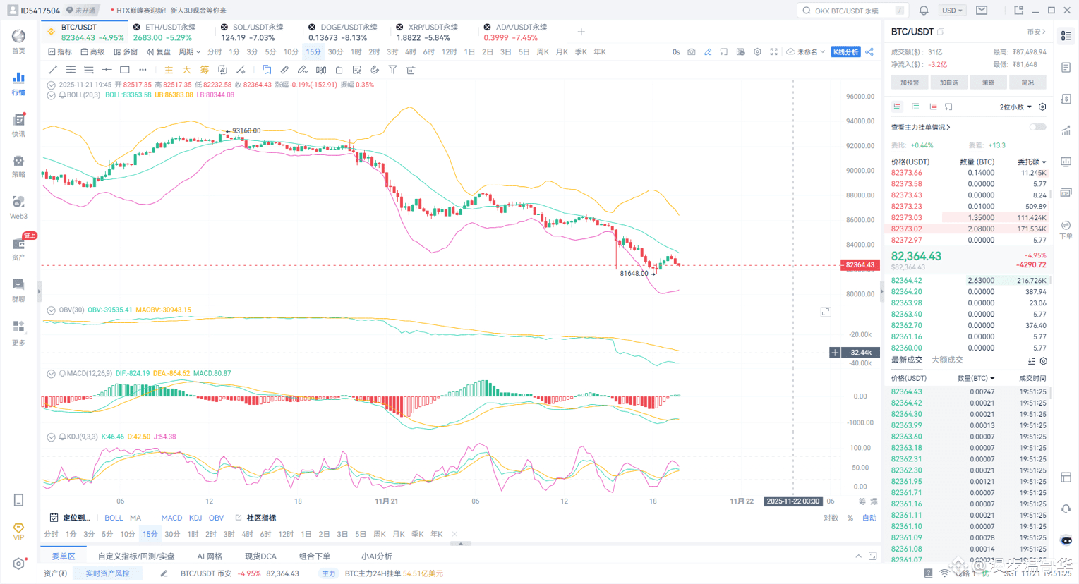 2025年11月21日晚间,比特币报价82,299美元,在过去24小时内跌幅10.30%,整体技术结构依然呈现明显的空头主导特征。尽管盘中出现技术性反抽,但多头力量明显不足,反弹在84,500-83,600美元区间遭遇强劲阻力,市场整体情绪偏向悲观。
