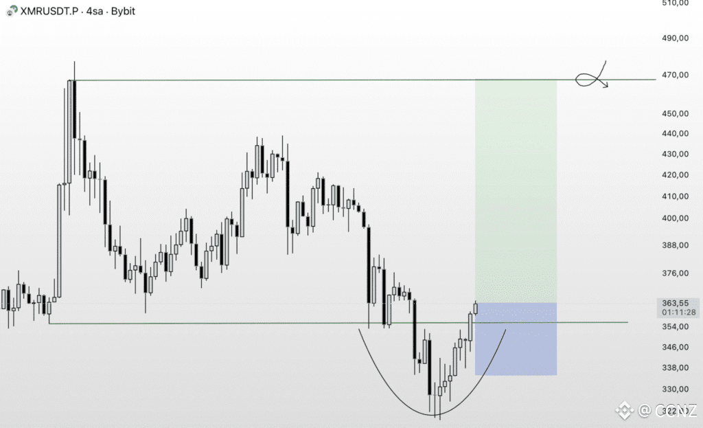 On Bybit’s 4-hour chart, a bullish structure may be forming. Crypto analyst LSTrader noted that Monero has broken above the neckline of an inverse head-and-shoulders pattern. The neckline was located around $354. The pattern could suggest further upside, with a projected target near $470 if the structure completes.