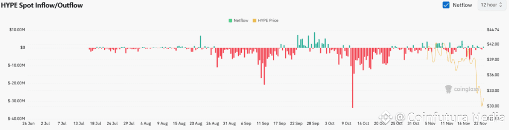 HYPE as of writing, traded at $31.49 with a daily decline of 6.22%. The weekly performance recorded an 18.53% pullback. Those numbers aligned with the broader shift in momentum as price entered deeper ranges.