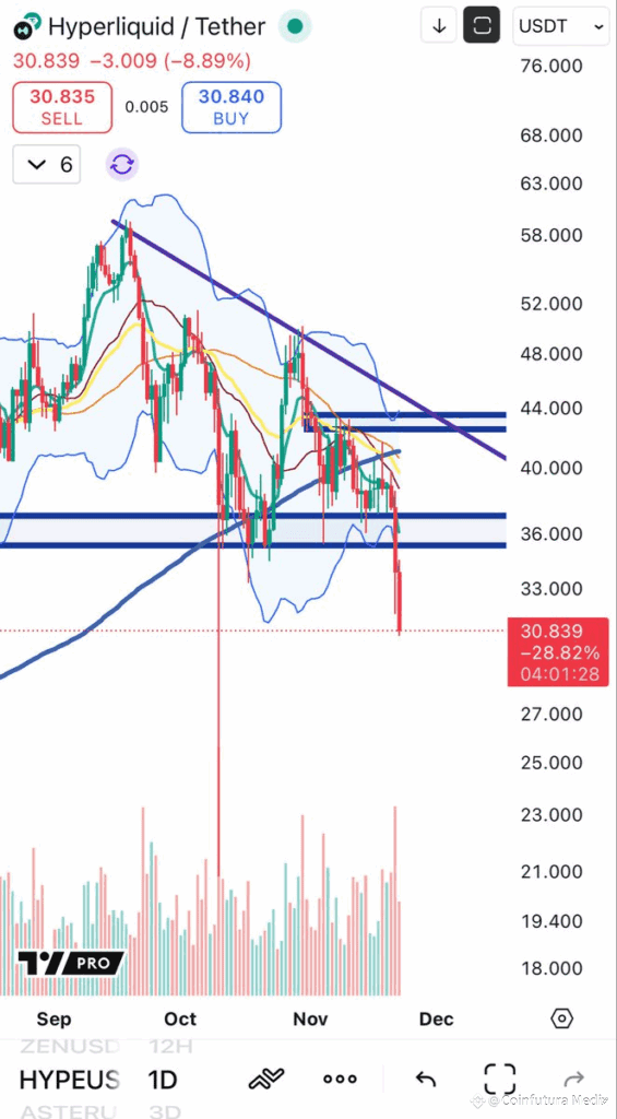 @BigCheds noted that $HYPE was “getting crushed” as sellers controlled each bounce. The move below the $39–$41 region accelerated the breakdown once the horizontal cluster failed. Price then traded well below moving averages, which continued to slope downward.