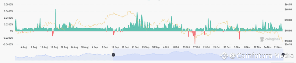 Trading volume fell by more than 35%, pointing to fading participation. The drop in volume during the sell-off suggested restricted interest from active buyers. That shift aligned with weaker sentiment as price pushed into the lower $30 region.