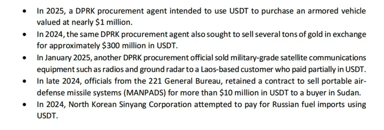 According to information provided by MSMT member states, at least since 2023, DPRK has attempted to expand the use of cryptocurrency from cybercrime to the exchange and payment for goods and services, such as using USDT in procurement-related transactions involving the sale and transfer of equipment and raw materials.
