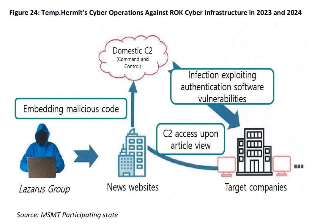 Between 2023 and 2024, Temp.Hermit disseminated malicious code exploiting vulnerabilities in commonly used identity verification software in South Korea, conducting 'waterhole attacks' on multiple South Korean news websites, implanting malicious code that infected users' computers accessing these sites. This code targeted vulnerabilities in identity verification software installed on infected computers and further spread, creating remotely controllable access points. Temp.Hermit also compromised IT asset management servers of certain South Korean institutions to identify potential weaknesses across the network.